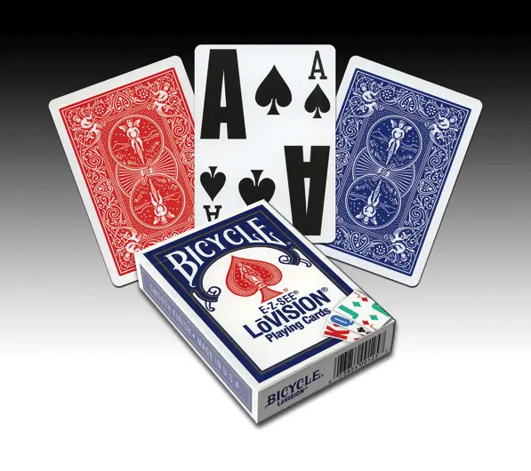 Bicycles spelkort med övertydliga beteckningar, för synsvaga. För att se tydlig skillnad på korten är klöver blå, ruter grön, hjärter röd och spader svart.