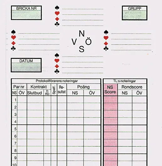 På detta protokoll för 20 par finns plats för notering av kortsitsen, vilket är en fördel både under och efter spelet. Två papperskulörer i varje bunt. 500 blad i block.