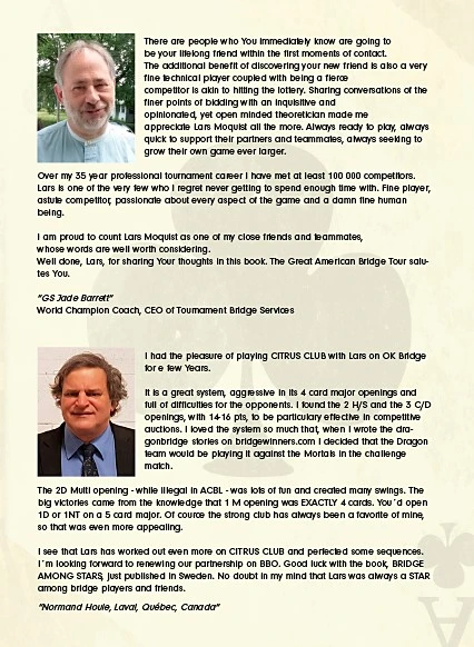 Omslagets baksida innehåller positiva kommentarer från två professionella bridgespelare – amerikanen GS Jade Barret och kanadensaren Normand Houle.