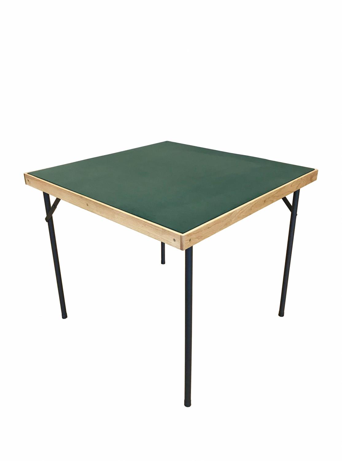 Hållbart spelbord med ihopfällbara stålben, ram i naturträ och duk i slitstark Alcantara.